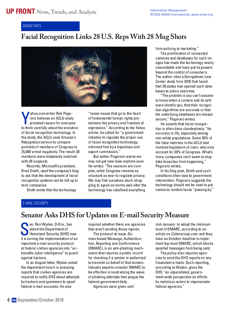 UP FRONT News, Trends, and AnalysisInformation Management 2018 ARMA International, www.arma.orgBIOMETRICSFacial Recognition Links 28 U.S. Reps With 28 Mug ShotsYahoo.com writer Rob Pegoraro believes