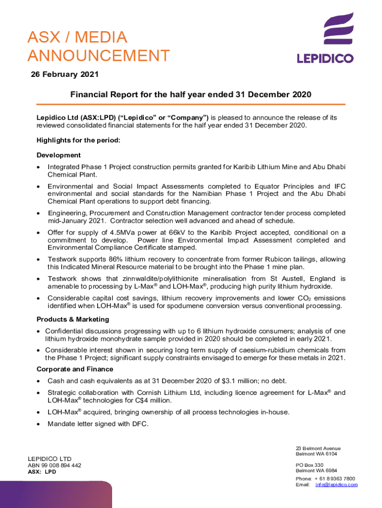 Get the free LPD:ASX Announcement - Half Yearly Report and Accounts