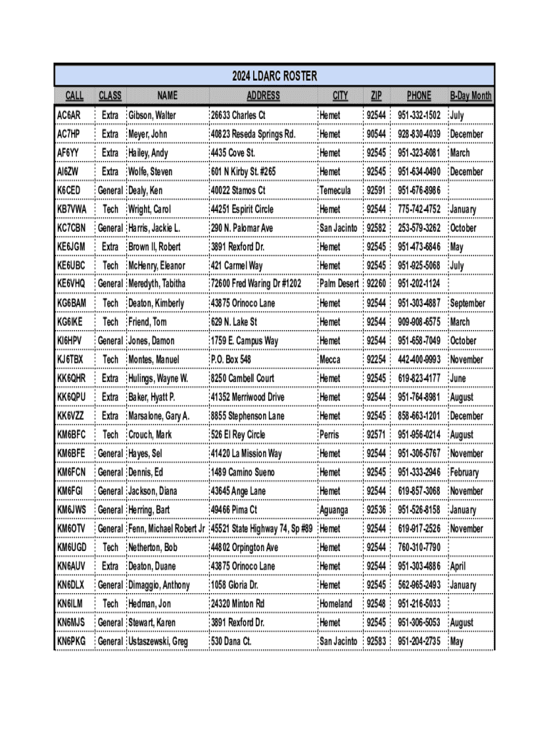 2024 LDARC ROSTER CALLCLASSNAMEAC6ARExtraGibson, Walter26633 Charles CtAC7HPExtraMeyer, JohnAF6YYExtraAI6ZWExtraK6CEDGeneral Dealy, KenKB7VWATechZIPPHONEHemet925449513321502July40823 Reseda Springs