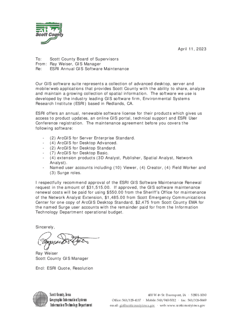 April 11, 2023To: Scott County Board of Supervisors From: Ray Weiser, GIS Manager Re: ESRI Annual GIS Software Maintenance Our GIS software suite represents a collection of advanced desktop, server