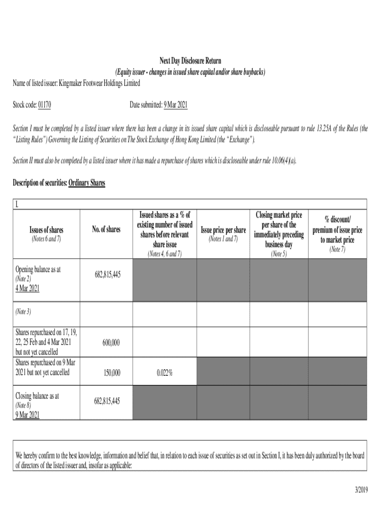 Next Day Disclosure Return (Equity issuerchanges in issued share capital and/or share buybacks) Name of listed issuer: Kingmaker Footwear Holdings Limited Stock code: 01170Date submitted: 9 Mar 2021Section