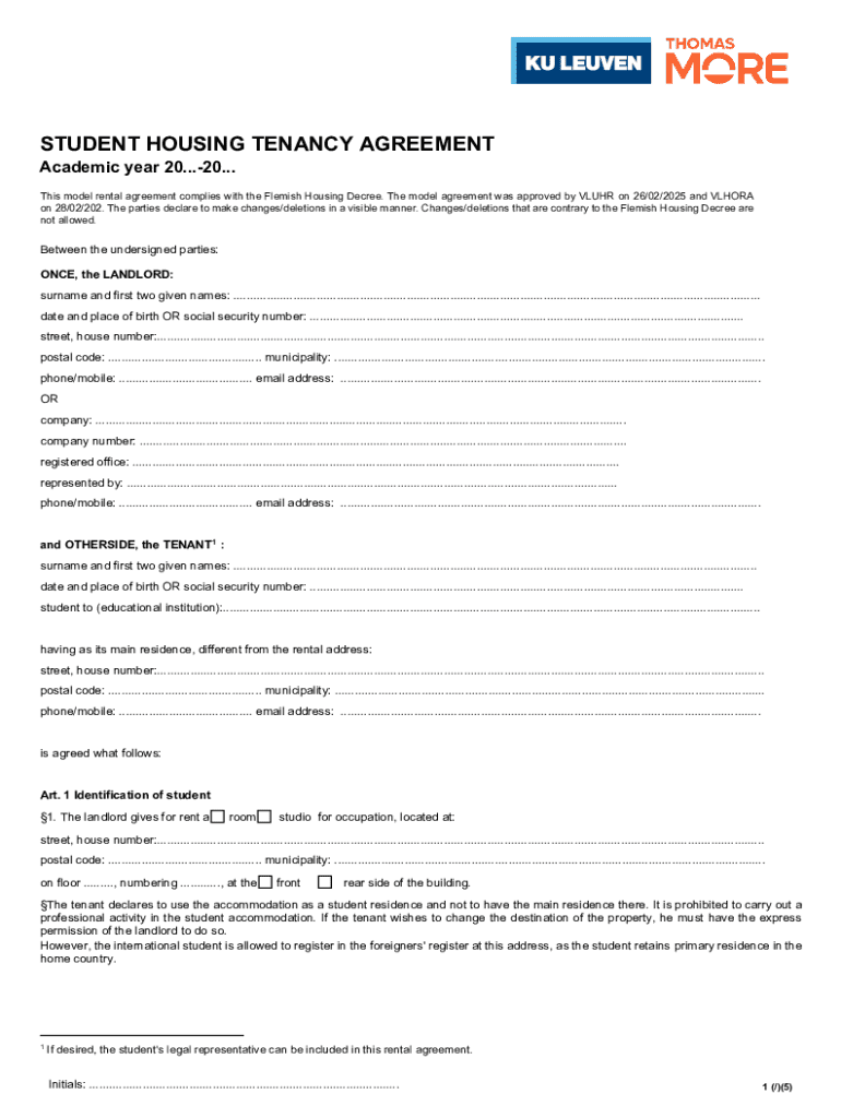 STUDENT HOUSING TENANCY AGREEMENTAcademic year 20...20...This model rental agreement complies with the Flemish Housing Decree. The model agreement was approved by VLUHR on 26/02/2025 and VLHORA on