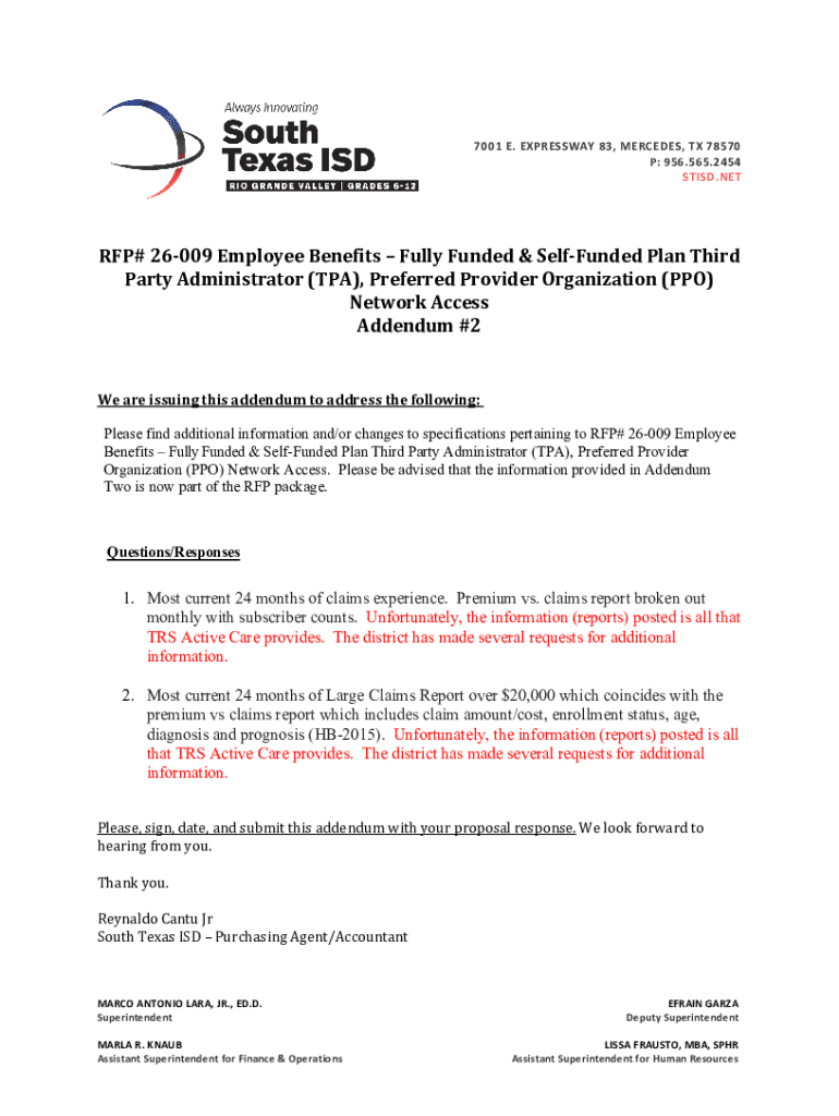 7001 E. EXPRESSWAY 83, MERCEDES, TX 78570 P: 956.565.2454 STISD.NETRFP# 26009 Employee BenefitsFully Funded & SelfFunded Plan Third Party Administrator (TPA), Preferred Provider Organization (PPO)