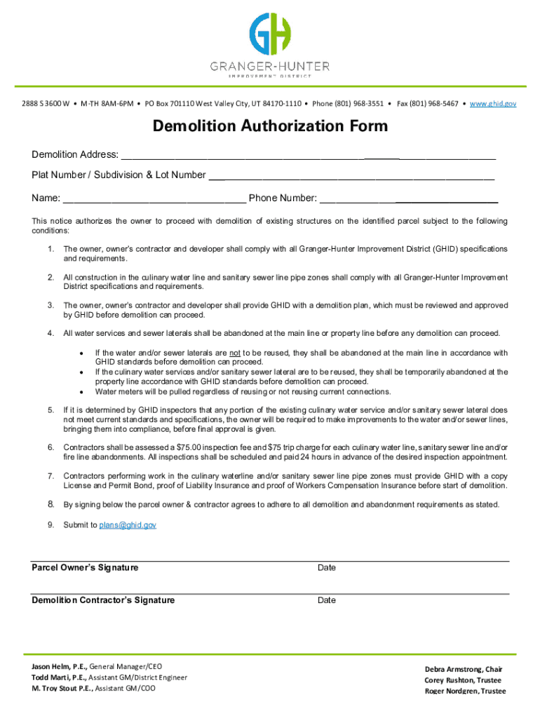 2888 S 3600 WMTH 8AM6PMPO Box 701110 West Valley City, UT 841701110Phone (801) 9683551Fax (801) 9685467www.ghid.govDemolition Authorization Form Demolition Address: ___ Plat Number / Subdivision &