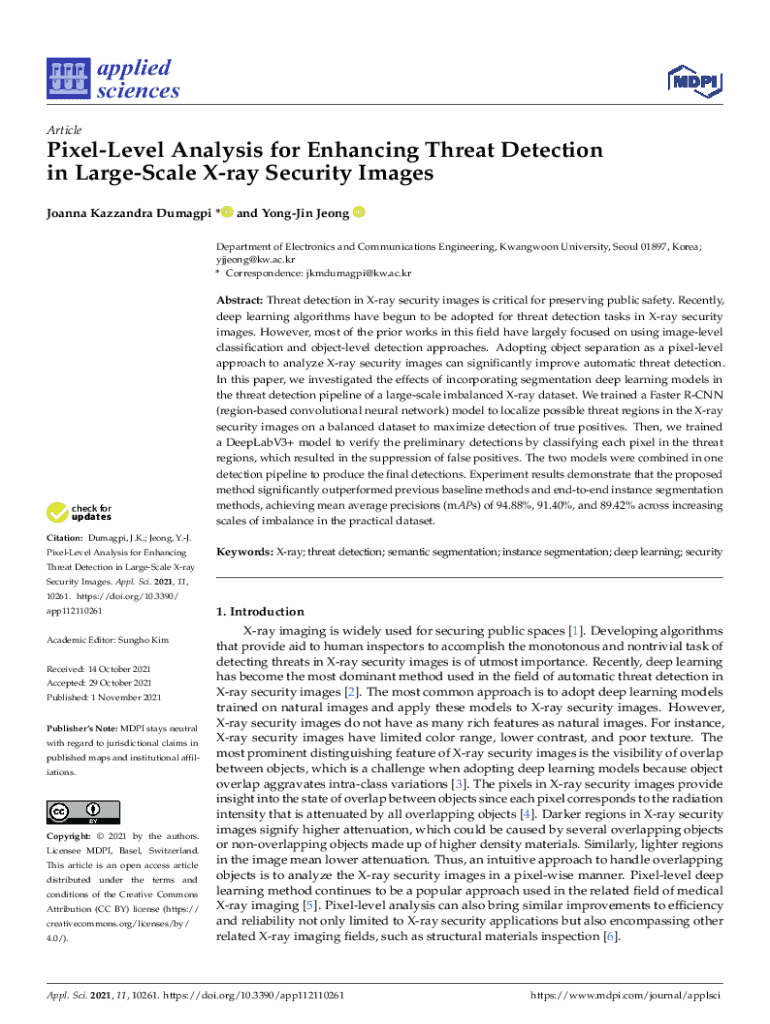 applied sciences ArticlePixelLevel Analysis for Enhancing Threat Detection in LargeScale Xray Security Images Joanna Kazzandra Dumagpi *and YongJin JeongDepartment of Electronics and Communications