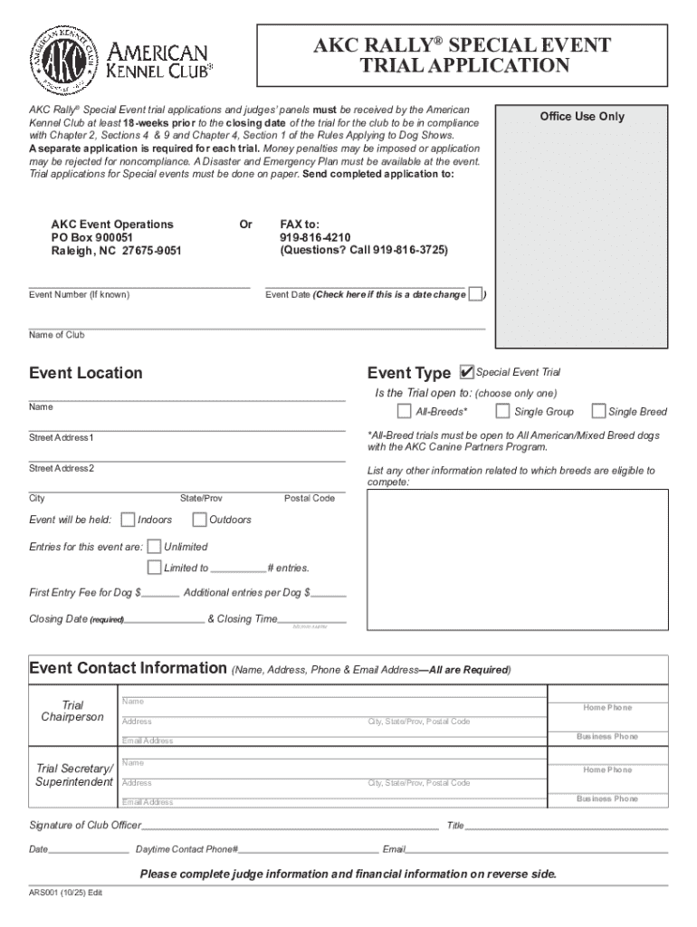 The AKC Rally Special Event Form is a crucial tool for event organizers and competitors alike. Its primary purpose is to facilitate the management and registration of special rally events governed by the American Kennel Club (AKC). These forms play an essential role in ensuring that events are properly documented, allowing for smooth scheduling and coordination among participants. By utilizing the AKC Rally Special Event Form, stakeholders can confidently address the finer details, including registration information, fees, and the judges panel.