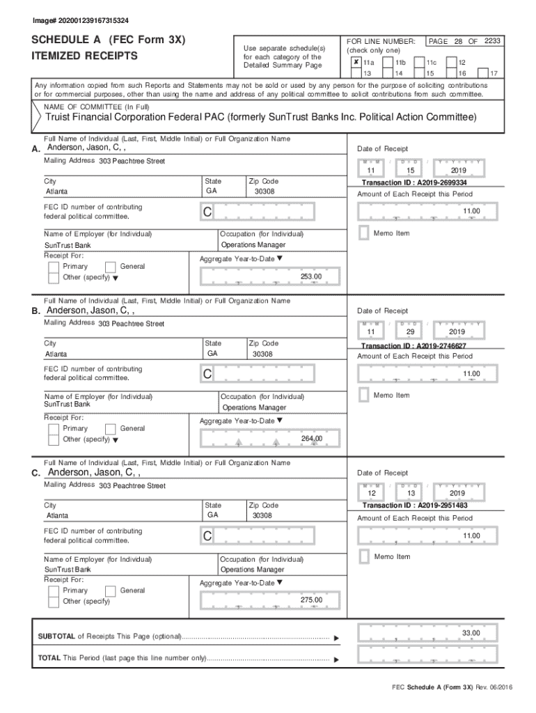 Image# 202001239167315324SCHEDULE A (FEC Form 3X) ITEMIZED RECEIPTSPAGE 28 OF 2233FOR LINE NUMBER: (check only one)Use separate schedule(s) for each category of the Detailed Summary Page 11a11b11c121314151617Any
