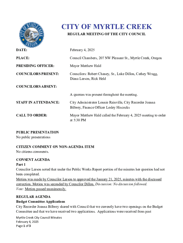 CITY OF MYRTLE CREEK REGULAR MEETING OF THE CITY COUNCILDATE:February 4, 2025PLACE:Council Chambers, 207 NW Pleasant St., Myrtle Creek, OregonPRESIDING OFFICER:Mayor Matthew HaldCOUNCILORS PRESENT:Councilors: