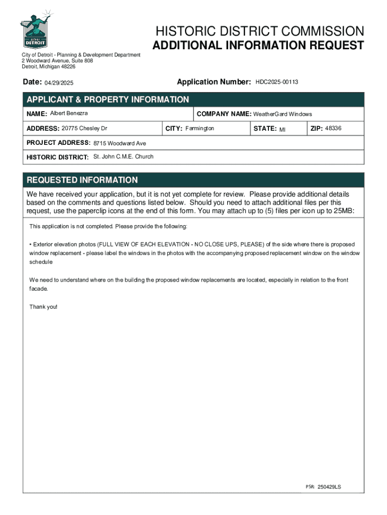 HISTORIC DISTRICT COMMISSION ADDITIONAL INFORMATION REQUEST City of DetroitPlanning & Development Department 2 Woodward Avenue, Suite 808 Detroit, Michigan 48226Date: 04/29/2025Application Number: