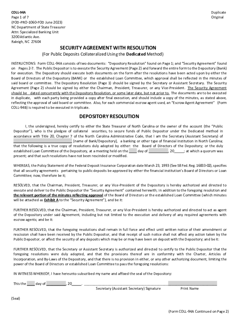 Duplicate OriginalCOLL94A Page 1 of 7 (FODPRO1060FOD June 2023) NC Department of State Treasurer Attn: Specialized Banking Unit 3200 Atlantic Ave. Raleigh, NC 27604SECURITY AGREEMENT WITH RESOLUTION