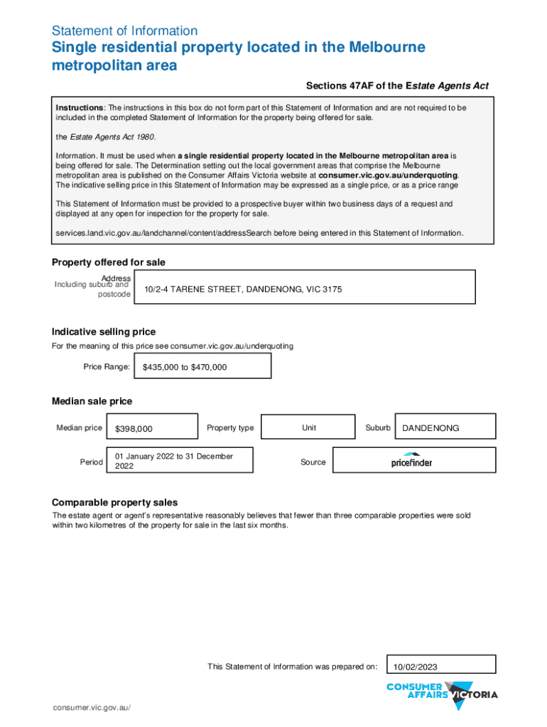 Statement of InformationSingle residential property located in the Melbourne metropolitan area Sections 47AF of the Estate Agents Act Instructions: The instructions in this box do not form part of