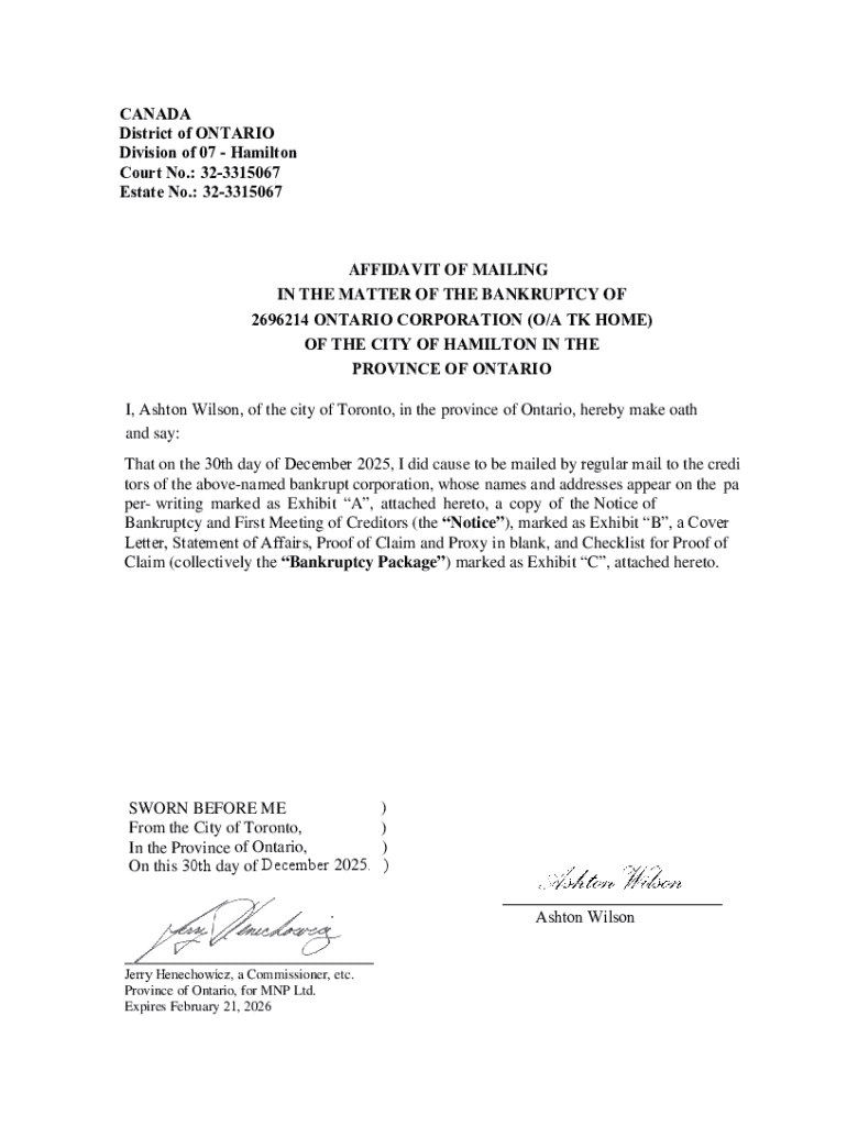 CANADA District of ONTARIO Division of 07Hamilton Court No.: 323315067 Estate No.: 323315067AFFIDAVIT OF MAILING IN THE MATTER OF THE BANKRUPTCY OF 2696214 ONTARIO CORPORATION (O/A TK HOME) OF THE