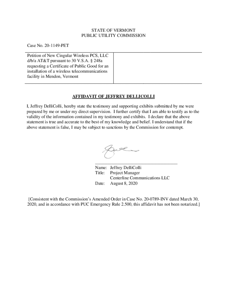 STATE OF VERMONT PUBLIC UTILITY COMMISSION Case No. 201149PET Petition of New Cingular Wireless PCS, LLC d/b/a AT&T pursuant to 30 V.S.A.248a requesting a Certificate of Public Good for an installation