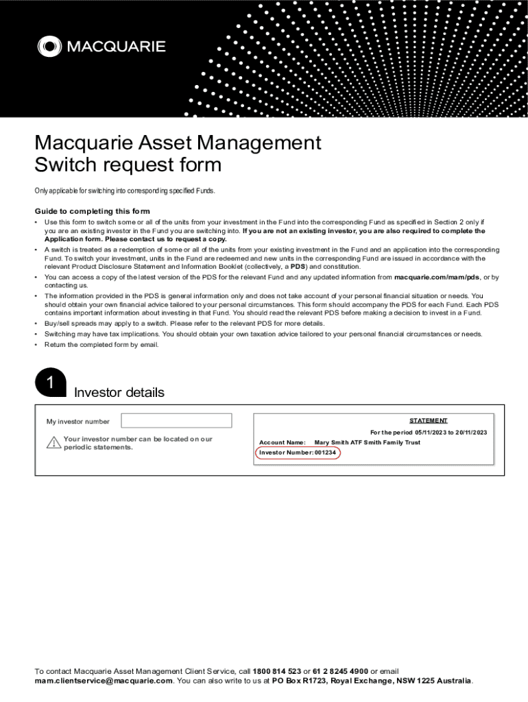 The Macquarie Asset Management Switch Form is a critical document used to manage and modify investments within the Macquarie asset management framework. This form allows investors to switch between different funds or investment options within their portfolio efficiently. By providing a structured approach to asset management, the switch form plays an essential role in ensuring that investors can optimize their investment strategies according to changing market conditions or personal financial goals.