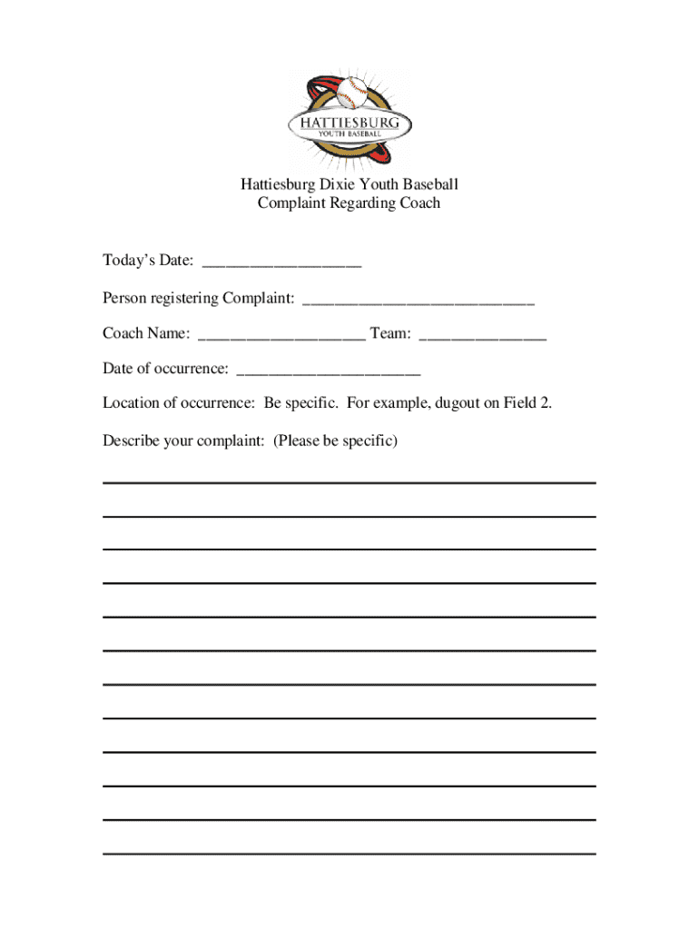 Hattiesburg Dixie Youth Baseball Complaint Regarding CoachTodays Date: ___ Person registering Complaint: ___ Coach Name: ___ Team: ___ Date of occurrence: ___ Location of occurrence: Be specific.