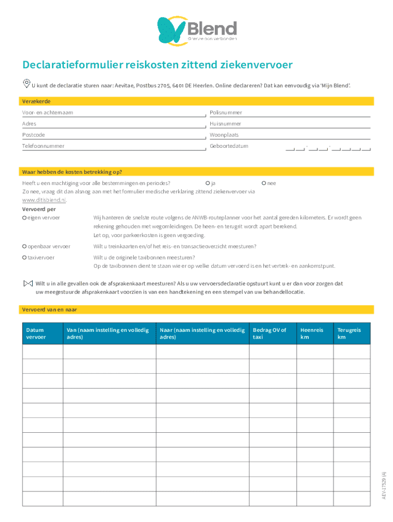 Declaratieformulier reiskosten zittend ziekenvervoer U kunt de declaratie sturen naar: Aevitae, Postbus 2705, 6401 DE Heerlen. Online declareren? Dat kan eenvoudig via Mijn Blend. Verzekerde Voor