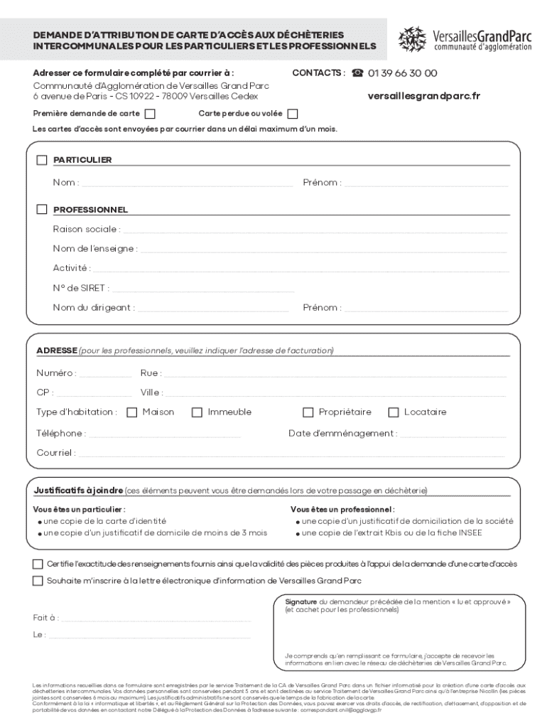 DEMANDE DATTRIBUTION DE CARTE DACCS AUX DCHTERIES INTERCOMMUNALES POUR LES PARTICULIERS ET LES PROFESSIONNELS Adresser ce formulaire complt par courrier: Communaut dAgglomration de Versailles Grand