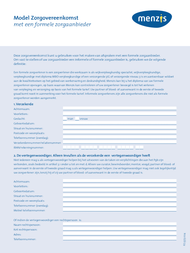 Model Zorgovereenkomst met een formele zorgaanbiederDeze zorgovereenkomst kunt u gebruiken voor het maken van afspraken met een formele zorgaanbieder. Om vast te stellen of uw zorgaanbieder een informele