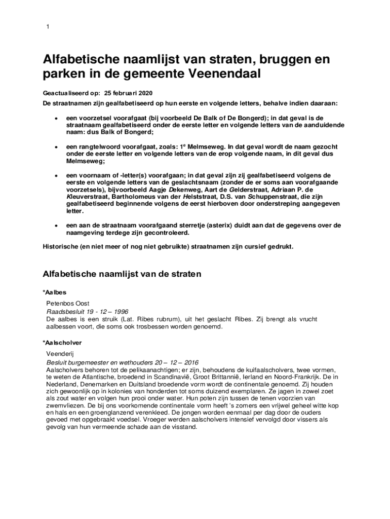 1Alfabetische naamlijst van straten, bruggen en parken in de gemeente Veenendaal Geactualiseerd op: 25 februari 2020 De straatnamen zijn gealfabetiseerd op hun eerste en volgende letters, behalve