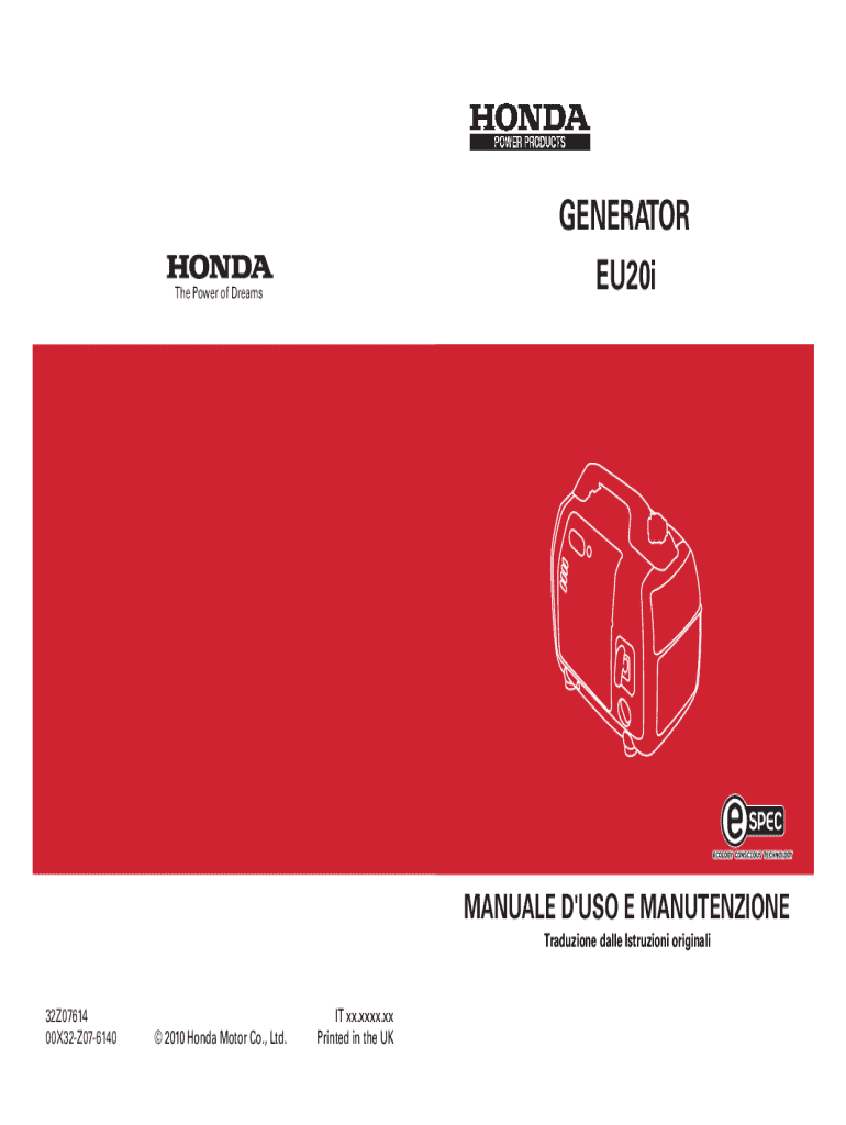 BlackDIC197GENERATOR EU20iThe Power of DreamsMANUALE D\'USO E MANUTENZIONE Traduzione dalle Istruzioni originali32Z07614 00X32Z076140 2010 Honda Motor Co., Ltd.IT xx.xxxx.xx Printed in the UK3LZ07614(EU20i)_IT.book