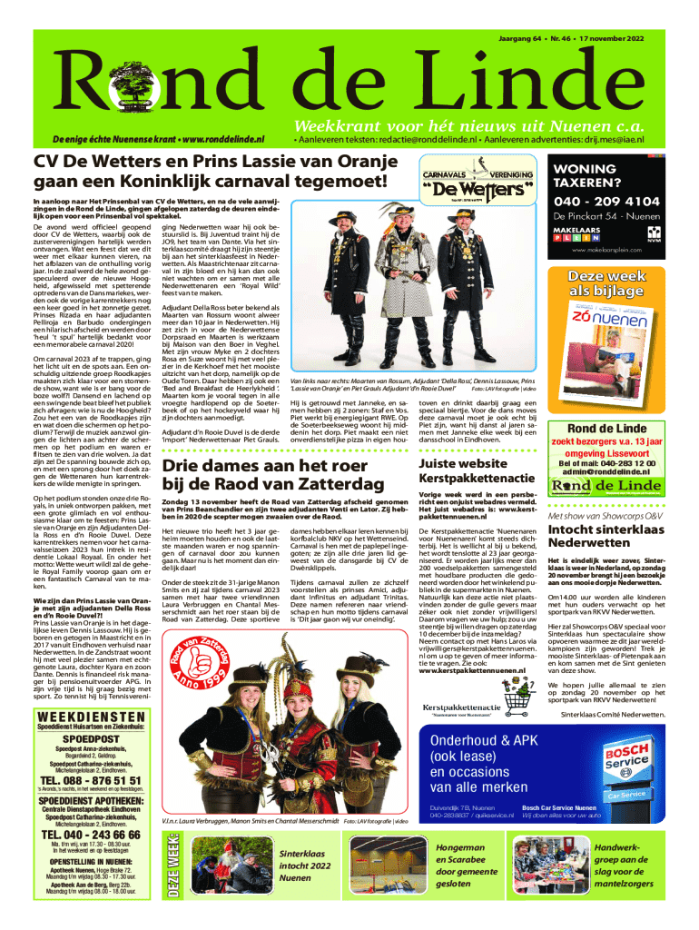 ROND DE LINDE week 46Donderdag 17 november 2022Jaargang 64Nr. 4617 november 2022Weekkrant voor ht nieuws uit Nuenen c.a.De enige chte Nuenense krantwww.ronddelinde.nl Aanleveren teksten: redactie@ronddelinde.nlAanleveren