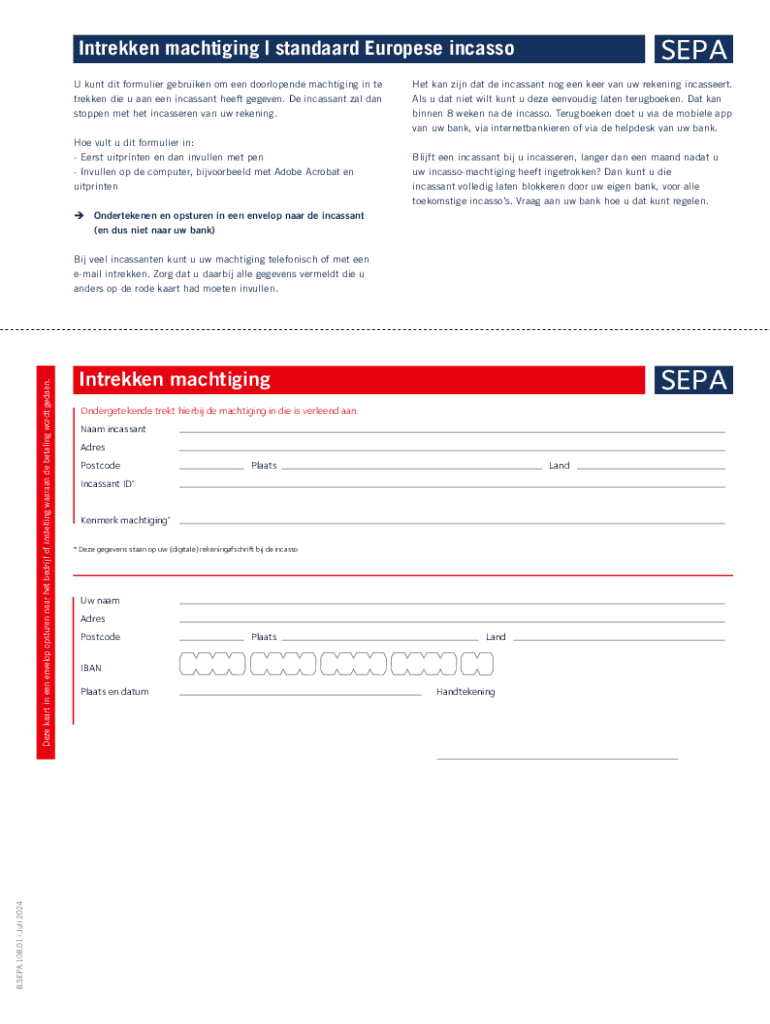 Intrekken machtiging | standaard Europese incasso U kunt dit formulier gebruiken om een doorlopende machtiging in te trekken die u aan een incassant heeft gegeven. De incassant zal dan stoppen met