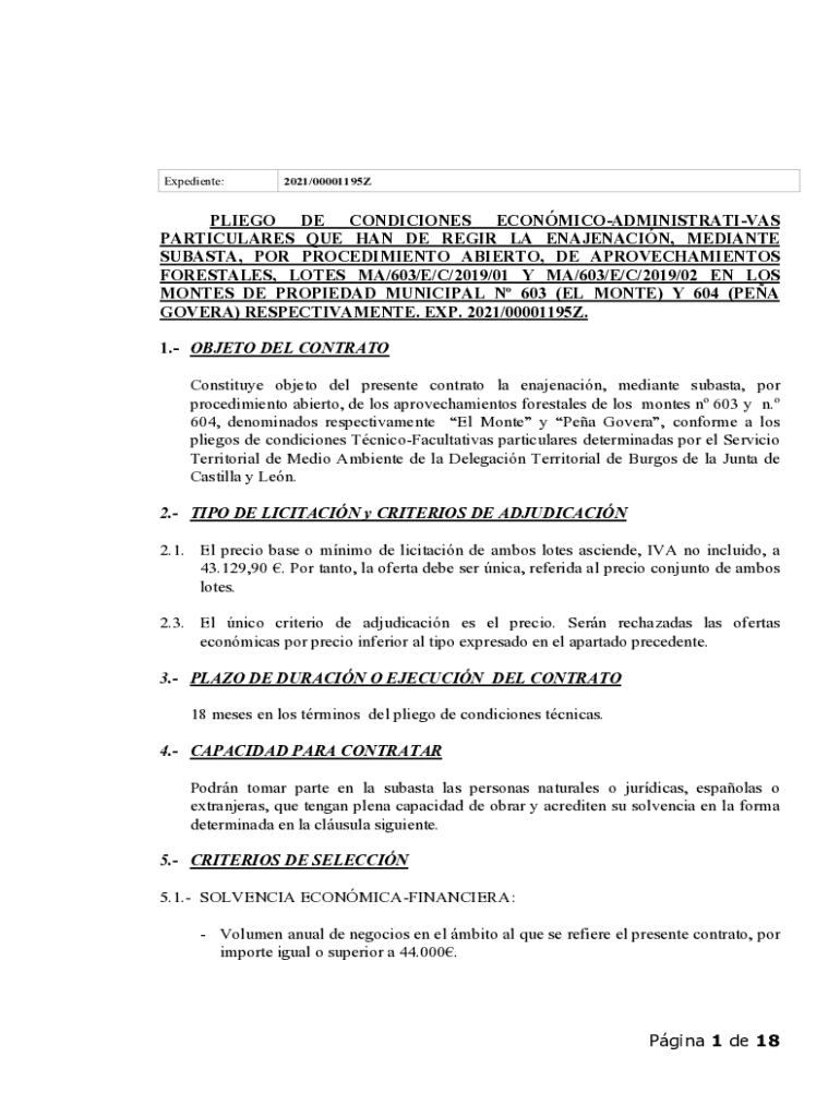 Expediente:2021/00001195ZPLIEGO DE CONDICIONES ECONMICOADMINISTRATIVAS PARTICULARES QUE HAN DE REGIR LA ENAJENACIN, MEDIANTE SUBASTA, POR PROCEDIMIENTO ABIERTO, DE APROVECHAMIENTOS FORESTALES, LOTES
