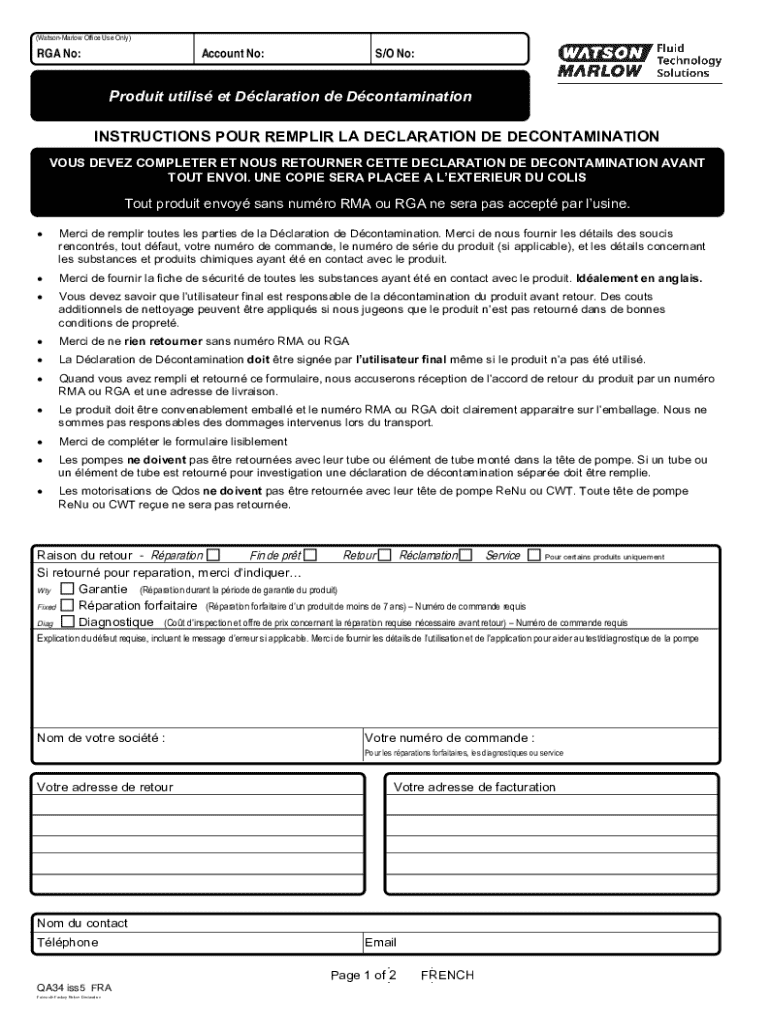 Obtenir le gratuit Decontamination declarationWatson-Marlow