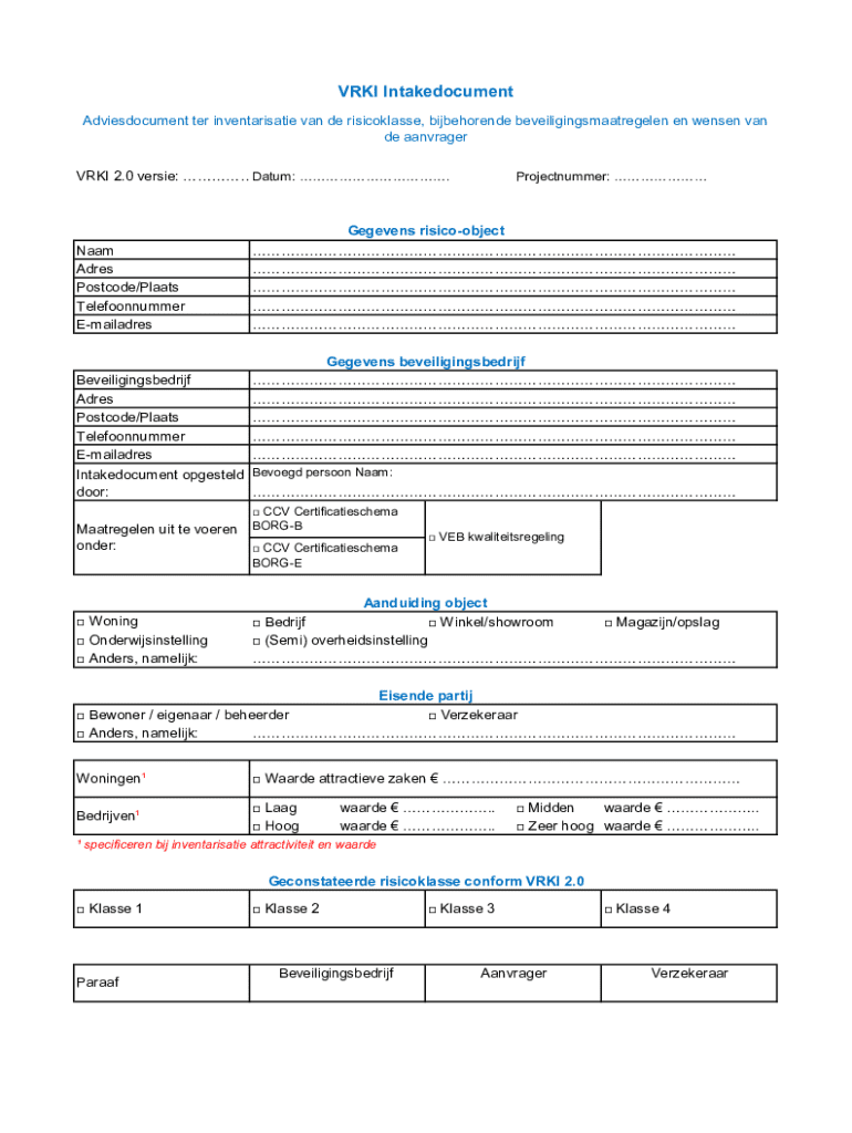 VRKI Intakedocument Adviesdocument ter inventarisatie van de risicoklasse, bijbehorende beveiligingsmaatregelen en wensen van de aanvrager VRKI 2.0 versie: .. Datum: .Projectnummer: Naam Adres Postcode/Plaats