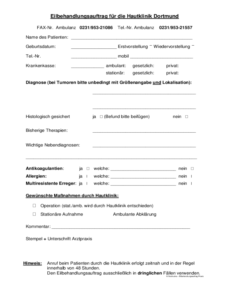Wie fülle ich eilbehandlungsauftrag fr die hautklinik aus?