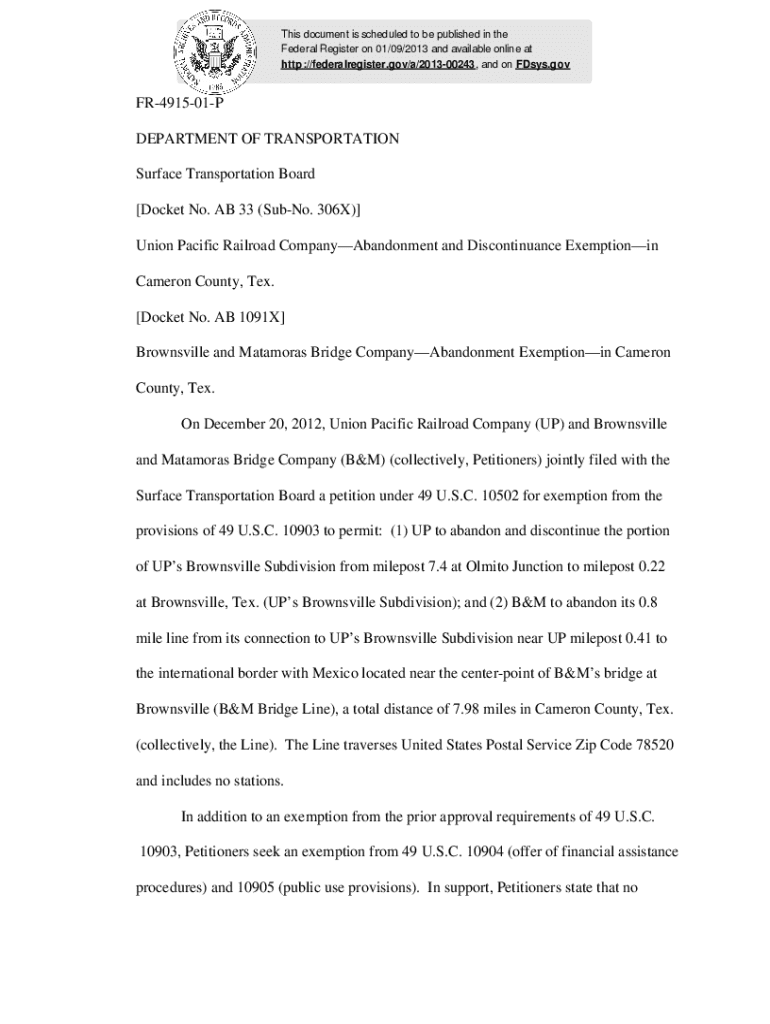 This document is scheduled to be published in the Federal Register on 01/09/2013 and available online at http://federalregister.gov/a/201300243, and on FDsys.govFR491501P DEPARTMENT OF TRANSPORTATION