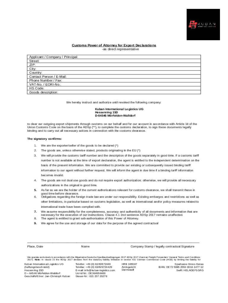 How should you fill out the Power of Attorney for Export customs declaration template