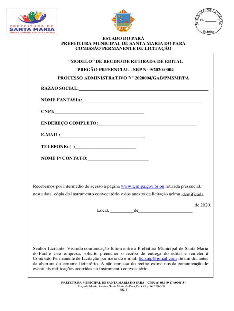 ESTADO DO PAR PREFEITURA MUNICIPAL DE SANTA MARIA DO PAR COMISSO PERMANENTE DE LICITAO MODELO DE RECIBO DE RETIRADA DE EDITAL PREGO PRESENCIALSRP N 9/20200004 PROCESSO ADMINISTRATIVO N 2020004/GAB/PMSMP/PA