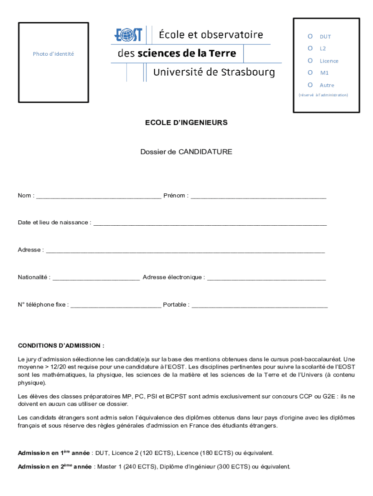 O DUT O L2Photo didentitO Licence O M1 O Autre (rservladministration)ECOLE DINGENIEURSDossier de CANDIDATURENom : ___ Prnom : ___Date et lieu de naissance : ___Adresse : ___Nationalit : ___ Adresse