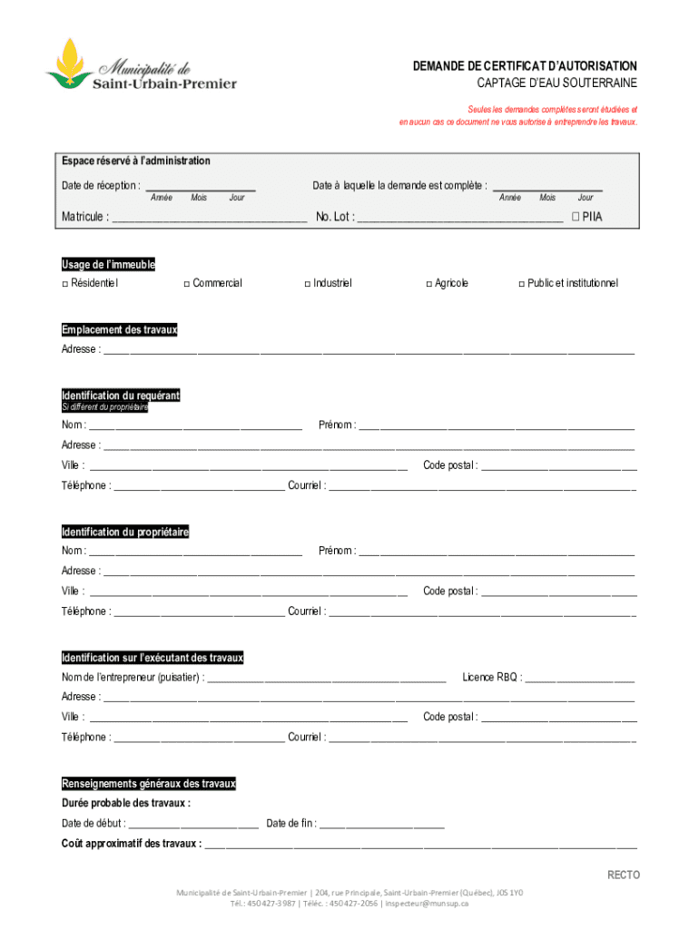 DEMANDE DE CERTIFICAT DAUTORISATION CAPTAGE DEAU SOUTERRAINE Seules les demandes compltes seront tudies et en aucun cas ce document ne vous autoriseentreprendre les travaux.Espace rservladministration