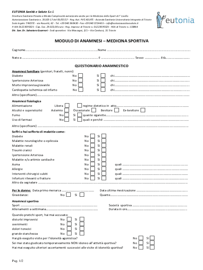 Ottieni il gratuito MODULO ANAMNESIMEDICINA SPORT