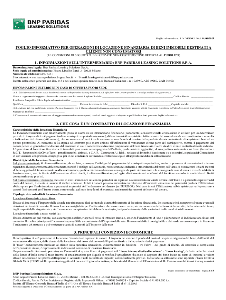 Ottieni il gratuito FOGLIO INFORMATIVO PER OPERAZIONI DI LOCAZIONE FINANZIARIA DI BENI IMMOBILI D...