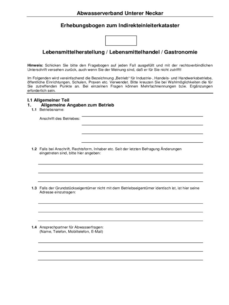 Holen Sie sich kostenlos Erhebungsbogen zum Abwasserkataster I. Allgemeiner Teil
