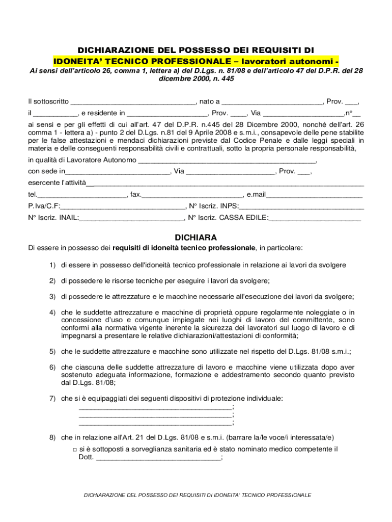 DICHIARAZIONE DEL POSSESSO DEI REQUISITI DI IDONEITA TECNICO PROFESSIONALElavoratori autonomi Ai sensi dellarticolo 26, comma 1, lettera a) del D.Lgs. n. 81/08 e dellarticolo 47 del D.P.R. del 28