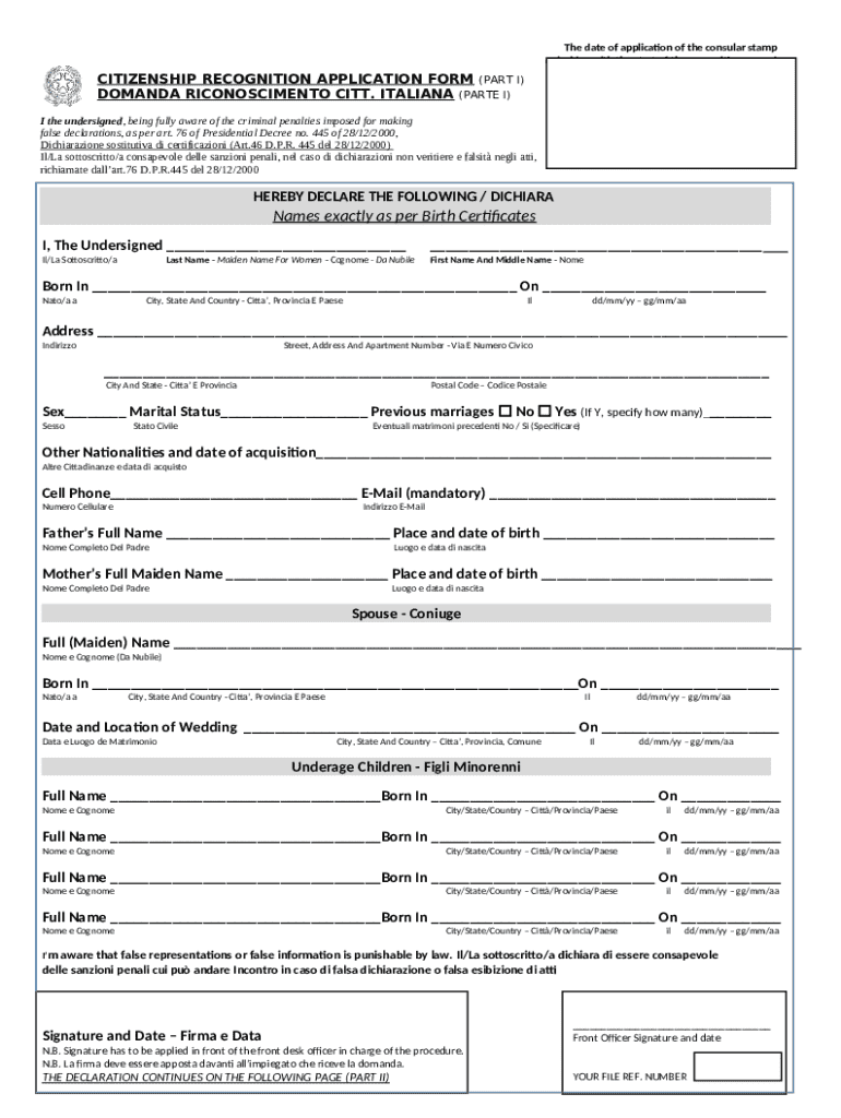 The Citizenship-Recognition-Application-. ... is a document that can be completed and signed for specific purpose. In that case, it is furnished to the relevant addressee in order to provide certain information and data. The completion and signing is available manually or via an appropriate solution e. g. PDFfiller. Such tools help to complete any PDF or Word file online. It also allows you to edit its appearance depending on your needs and put a valid electronic signature. Once finished, you send the Citizenship-Recognition-Application-. ... to the respective recipient or several of them by mail and even fax. PDFfiller offers a feature and options that make your template printable. It includes a variety of settings when printing out appearance. It does no matter how you will file a document - physically or electronically - it will always look professional and clear. To not to create a new document from scratch all the time, turn the original form into a template. Later, you will have a customizable sample.