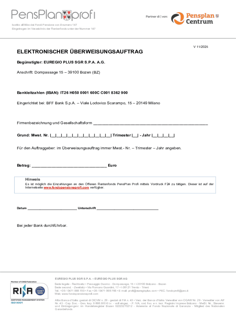 Iscritto allAlbo dei Fondi Pensione con il numero 147 Eingetragen im Verzeichnis der Rentenfonds unter der Nummer 147V 11/2025ELEKTRONISCHER BERWEISUNGSAUFTRAG Begnstigter: EUREGIO PLUS SGR S.P.A.
