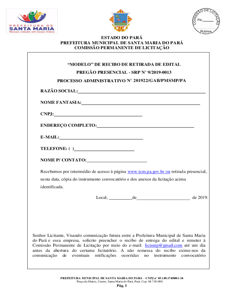 ESTADO DO PAR PREFEITURA MUNICIPAL DE SANTA MARIA DO PAR COMISSO PERMANENTE DE LICITAOMODELO DE RECIBO DE RETIRADA DE EDITAL PREGO PRESENCIALSRP N 9/20190013 PROCESSO ADMINISTRATIVO N 201922/GAB/PMSMP/PA