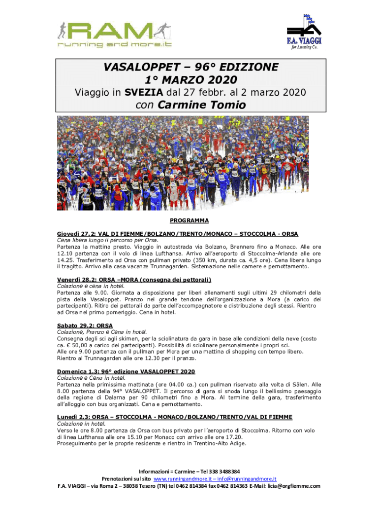 VASALOPPET96 EDIZIONE 1 MARZO 2020 Viaggio in SVEZIA dal 27 febbr. al 2 marzo 2020con Carmine TomioPROGRAMMA Gioved 27.2: VAL DI FIEMME/BOLZANO/TRENTO/MONACOSTOCCOLMAORSA Cena libera lungo il percorso