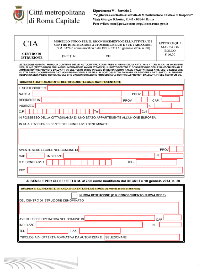 Dipartimento VServizio 2 Vigilanza e controllo su attivit di Motorizzazione Civile e di trasporto Viale Giorgio Ribotta, 41/4300144 Roma Pec: svileconom@pec.cittametropolitanaroma.gov.itCIAMODELLO