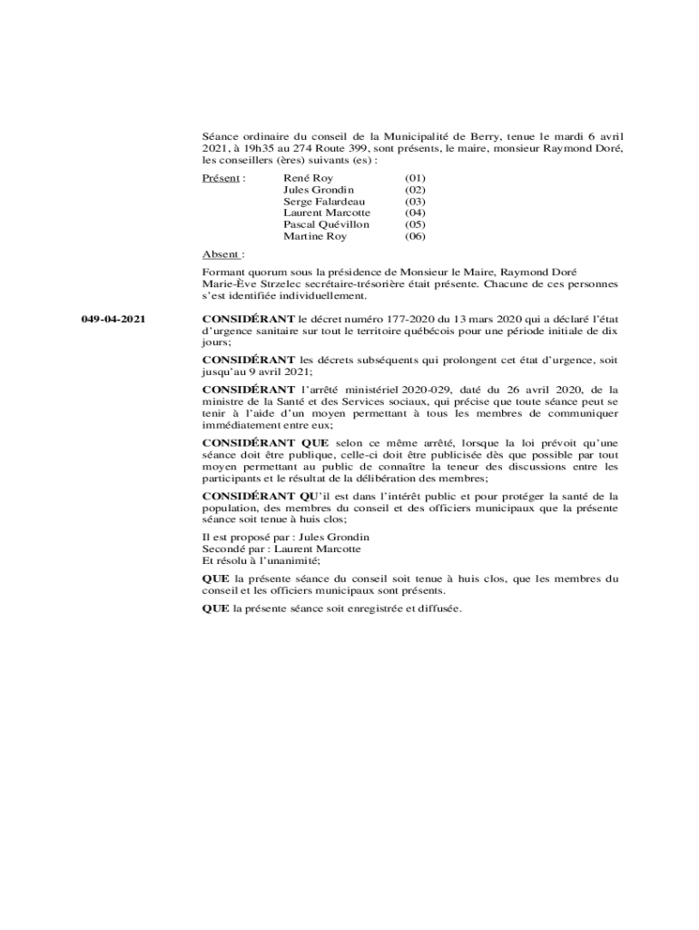 Obtenir le gratuit Sance ordinaire du conseil de la Municipalit de Berry, tenue le mardi 6 avril