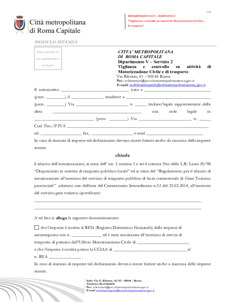 1/4 DIPARTIMENTO VSERVIZIO 2 Vigilanza e controllo su attivit di Motorizzazione Civile e di trasportoMODULO ISTANZA CITTA METROPOLITANA DI ROMA CAPITALE Dipartimento VServizio 2 Vigilanza e controllo