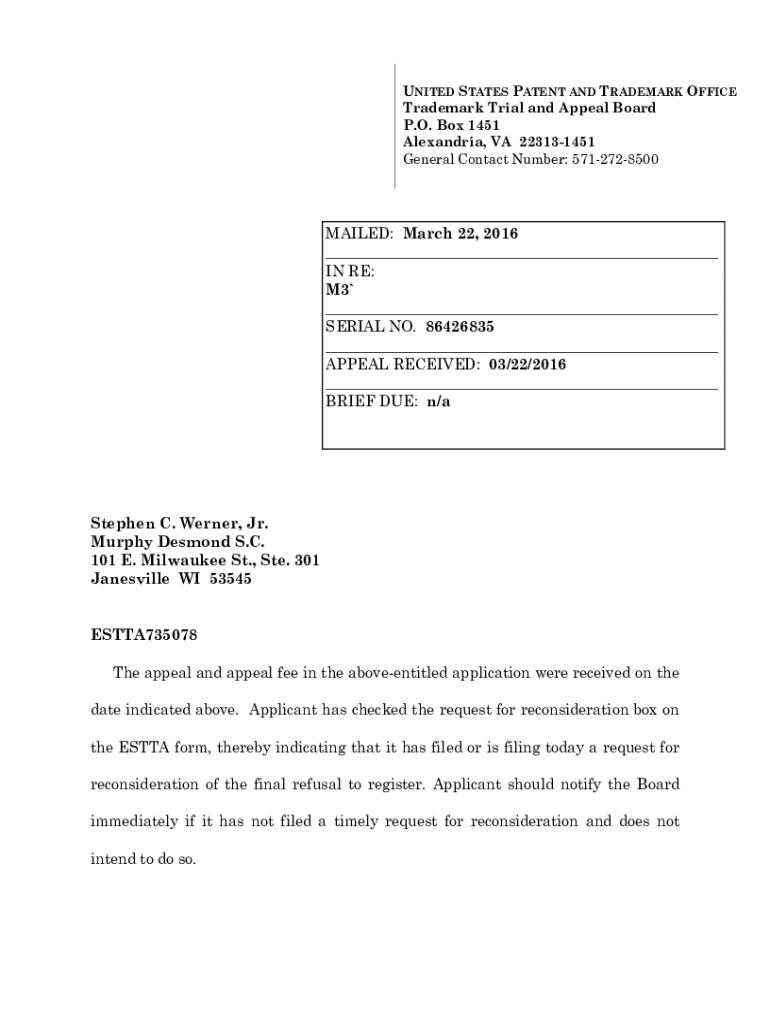 UNITED STATES PATENT AND TRADEMARK OFFICE Trademark Trial and Appeal Board P.O. Box 1451 Alexandria, VA 223131451 General Contact Number: 5712728500MAILED: March 22, 2016 ___ IN RE: M3` ___ SERIAL