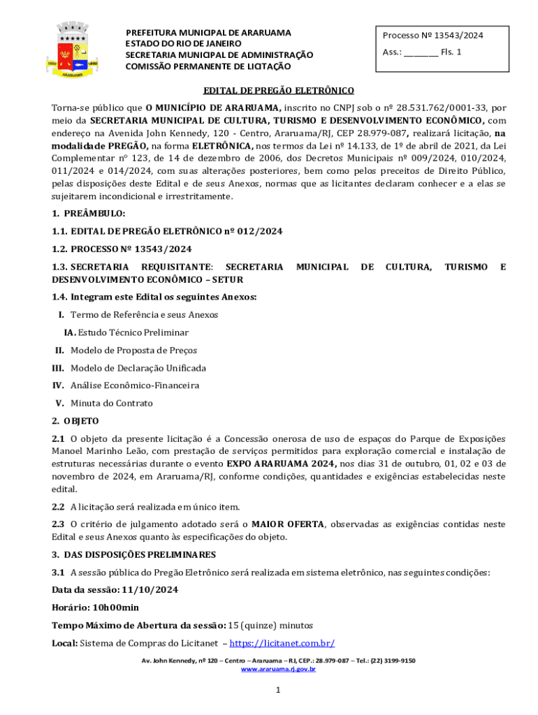 PREFEITURA MUNICIPAL DE ARARUAMA ESTADO DO RIO DE JANEIRO SECRETARIA MUNICIPAL DE ADMINISTRAO COMISSO PERMANENTE DE LICITAOProcesso N 13543/2024 Ass.: ___ Fls. 1EDITAL DE PREGO ELETRNICO Tornase pblico