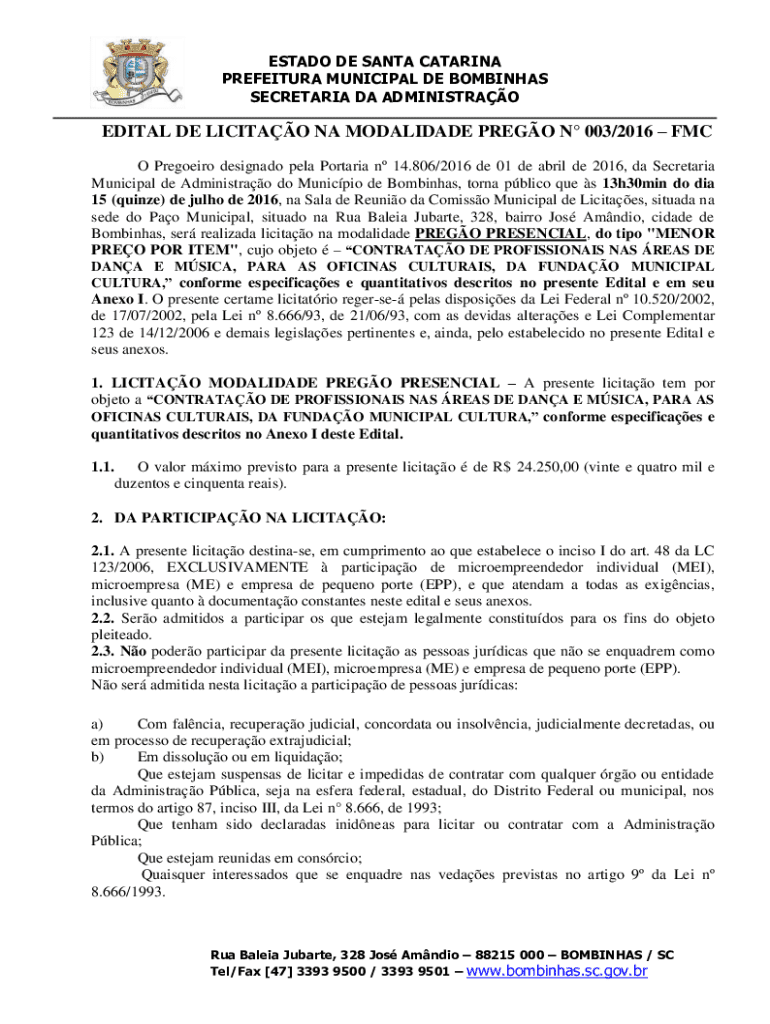 Obtenha o gratuito Municipal de Administrao do Municpio de Bombinhas, torna pblico que s 13h30min...