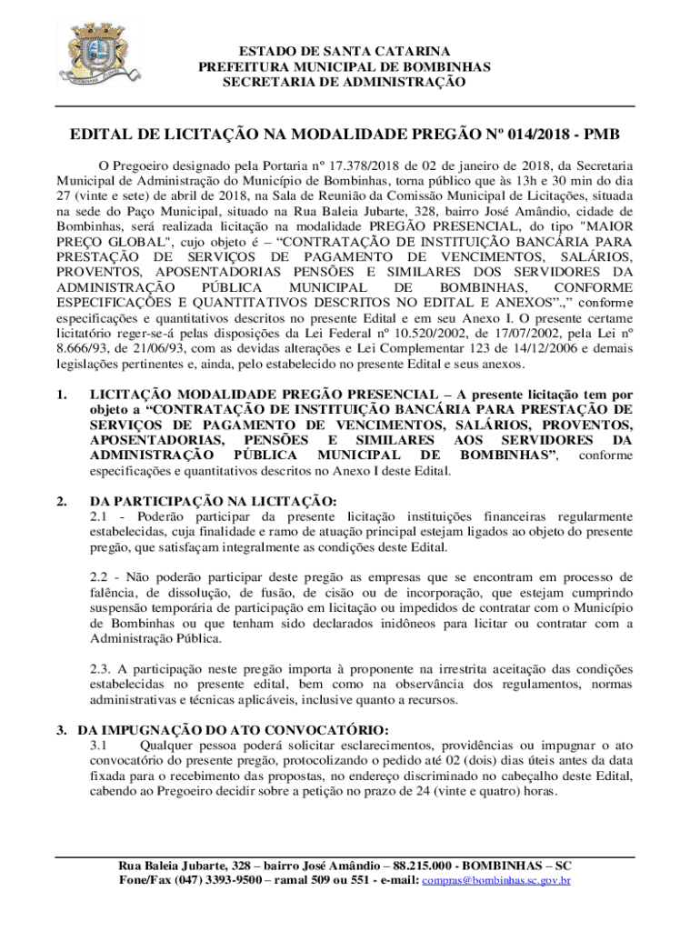Obtenha o gratuito Municipal de Administrao do Municpio de Bombinhas, torna pblico que s 13h e 30...